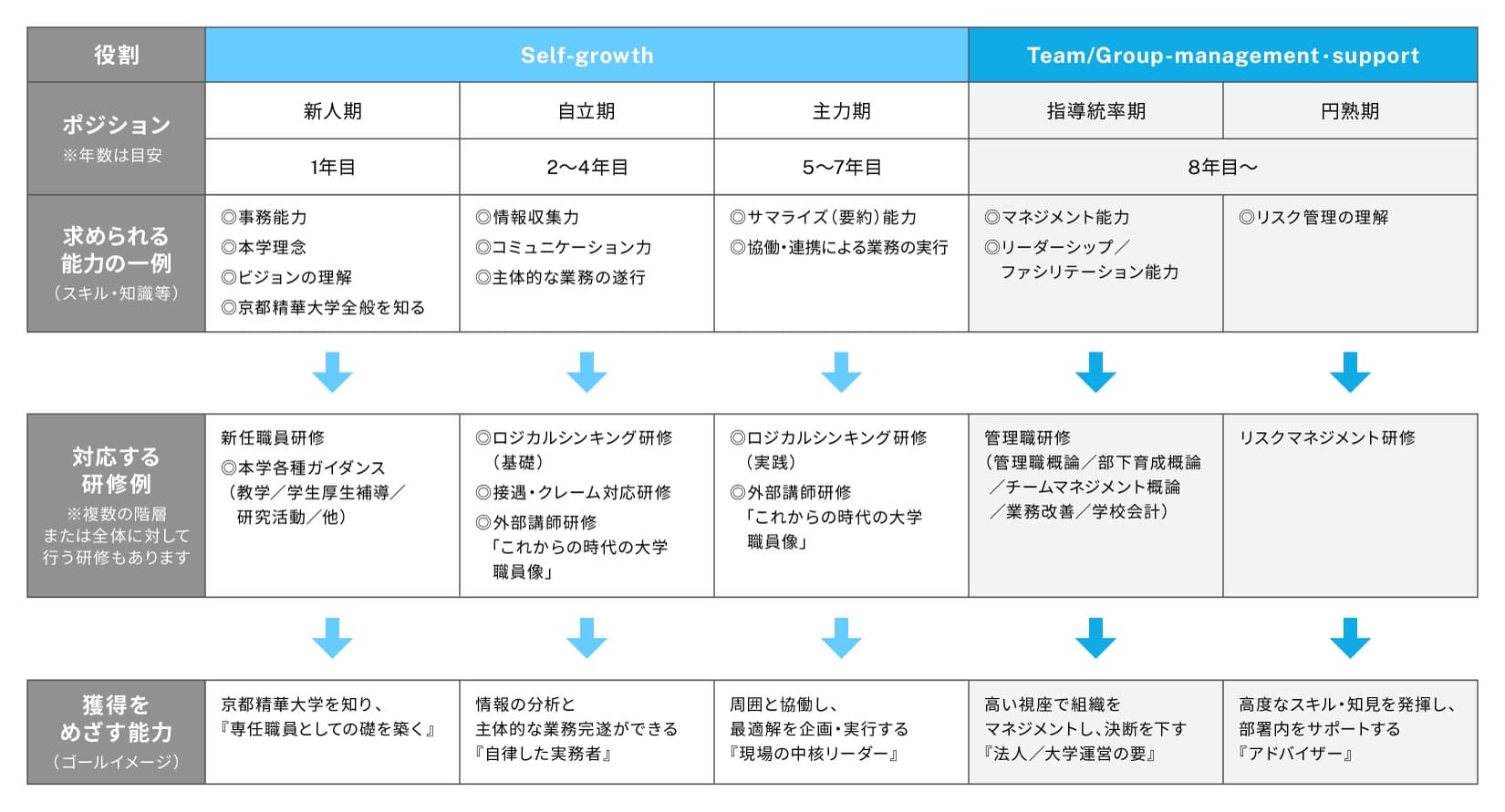 本学専任職員としてのキャリアの成長・育成目標を掲げ、その実現の一環としてキャリア年数に応じた研修を段階的に実施しています。